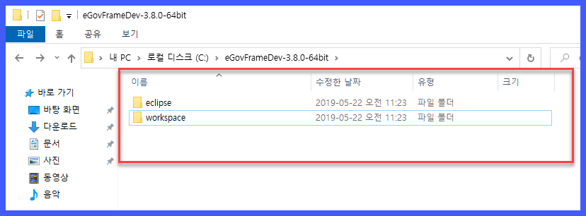 아래와 같이 c:\eGovFrameDev-3.8.0-64bit 폴더가 생성이 되었다.
