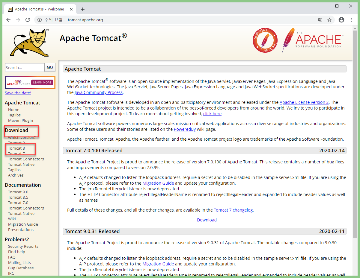 2. 좌측의 Download > Tomcat 8 을 클릭한다.