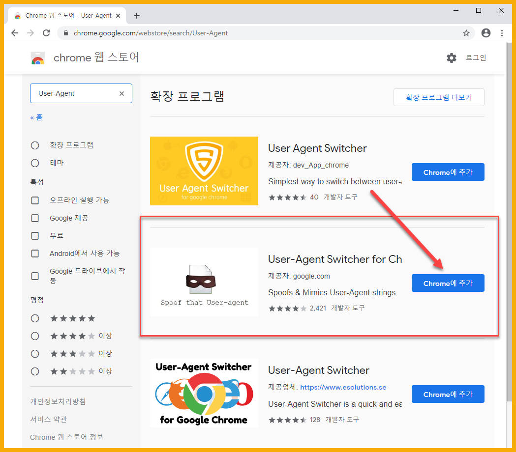 - User-Agent Switcher for Chrome 을 사용할 것이라 그 옆에 있는 Chrome에 추가 클릭