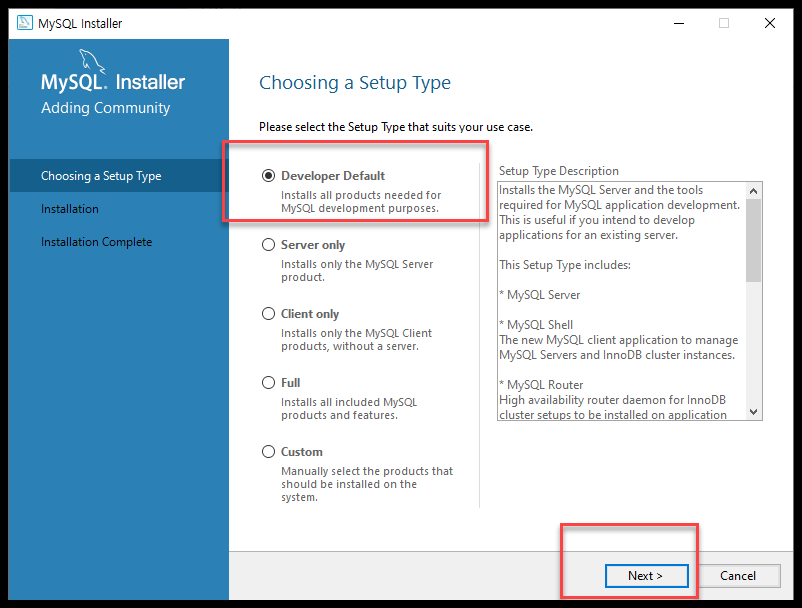 - Choosing a Setup type 에서 선택을 다시 한다. Server only로 한다.